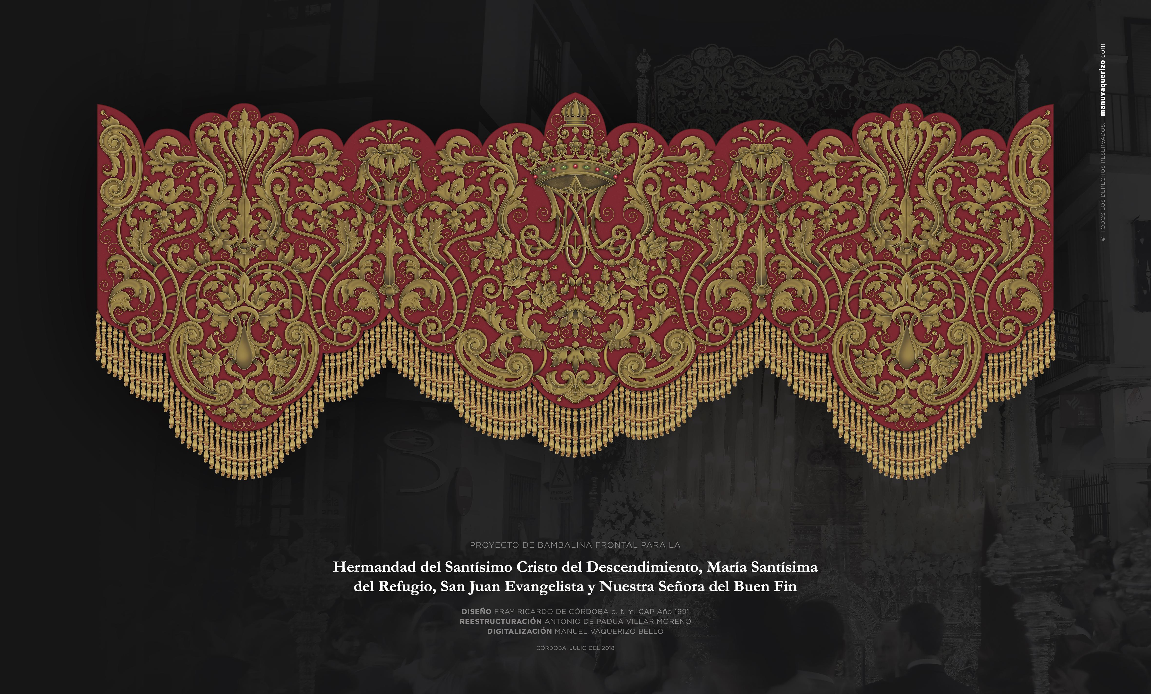 Con estas modificaciones, la bambalina frontal queda resuelta de esta manera, la zona central se engrandece y sube, dejando mayor visión de Nuestra Señora del Buen Fin, en el centro de este, una María coronada como motivo central, rodeada por siete rosas. Los paños laterales se alargan con el movimiento de algunas piezas, se respetan esos medallones que tanta personalidad dan al palio así como se suprimen los picos que frenan el movimiento. La zona de la crestería se estiliza e iguala a formas onduladas. La pieza será rematada por un exquisito fleco de bellota en oro fino y borlas entre varales que hará las delias en el oído cada Viernes Santo.