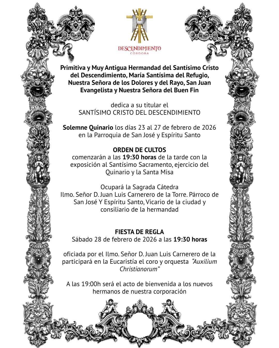 La Hermandad tiene el honor de anunciar la celebración del Solemne Quinario en honor al Santísimo Cristo del Descendimiento, que se celebrará D.M. del 23 al 27 de febrero, comenzando cada día a las 19:30 horas.